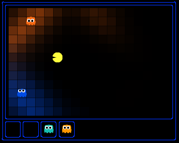 In the Pacman display, high posterior beliefs are represented by bright colors, while low beliefs are represented by dim colors. You should start with a large cloud of belief that shrinks over time as more evidence accumulates. As you watch the test cases, be sure that you understand how the squares converge to their final coloring.